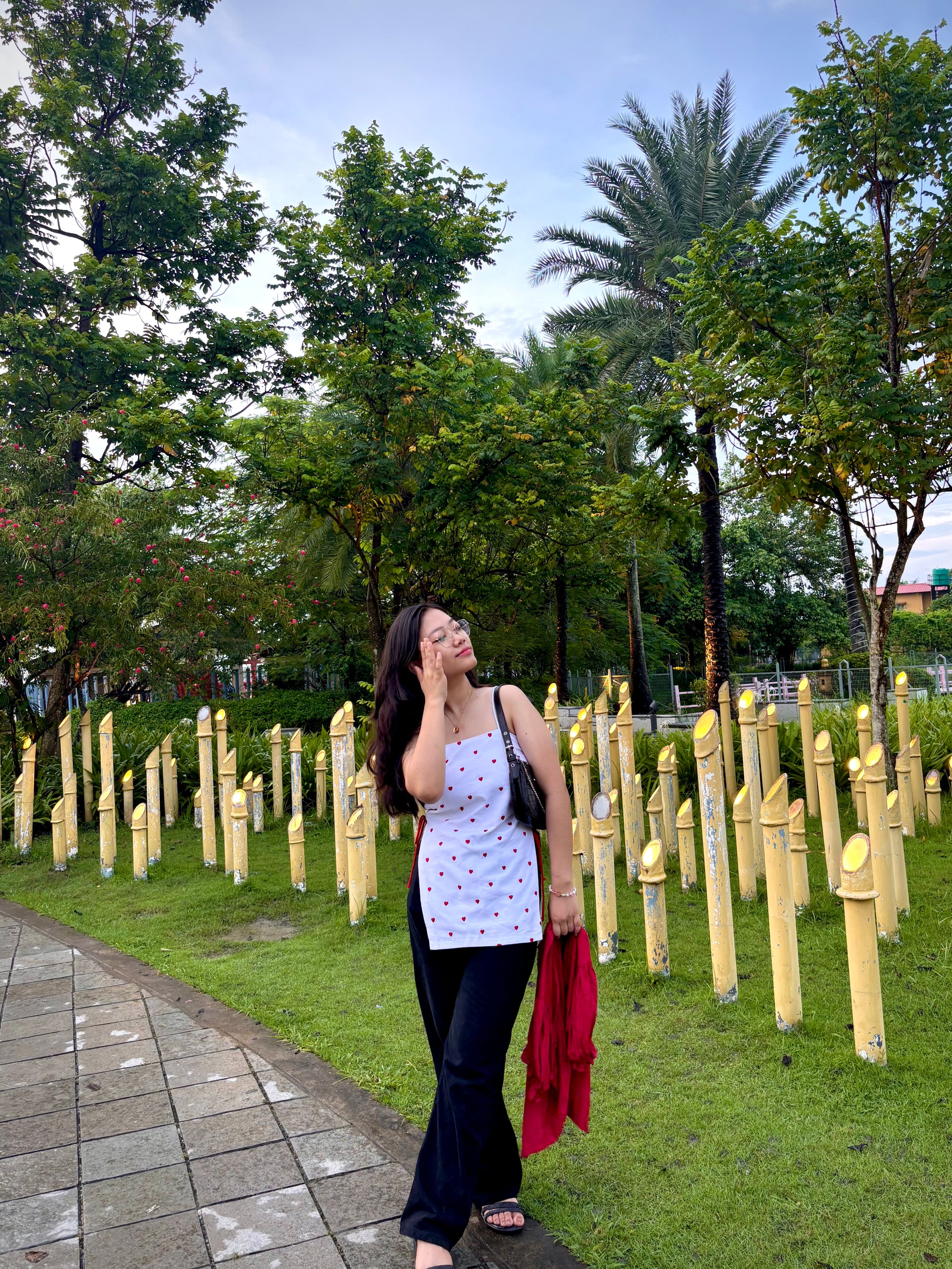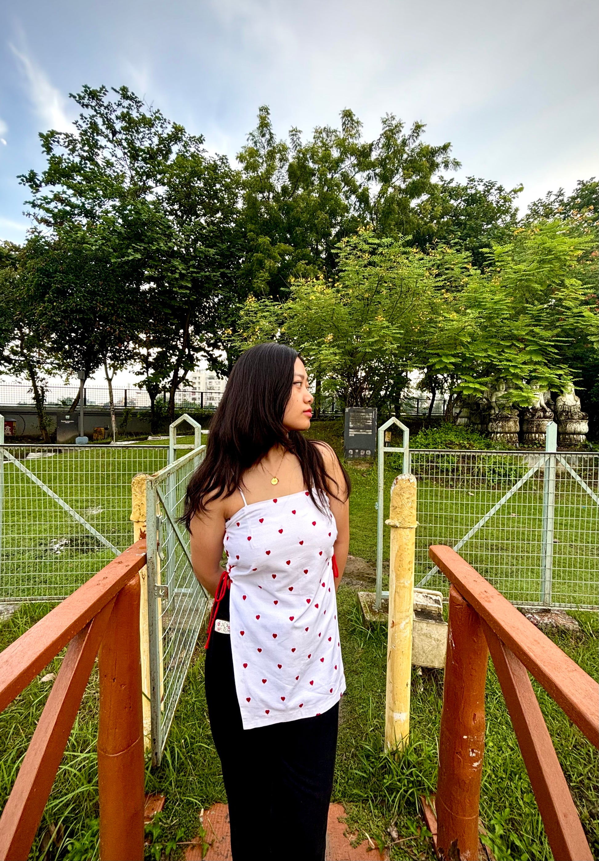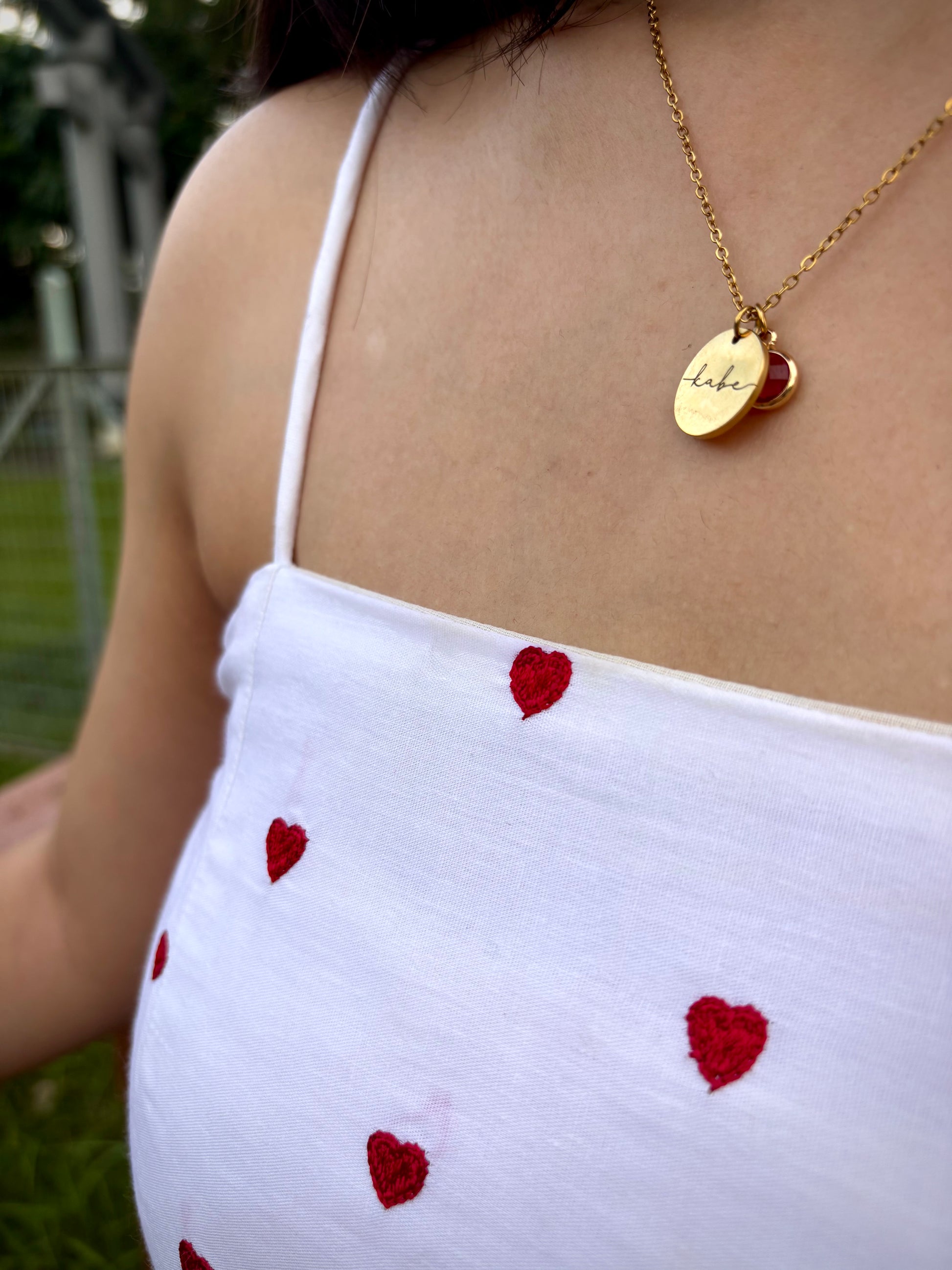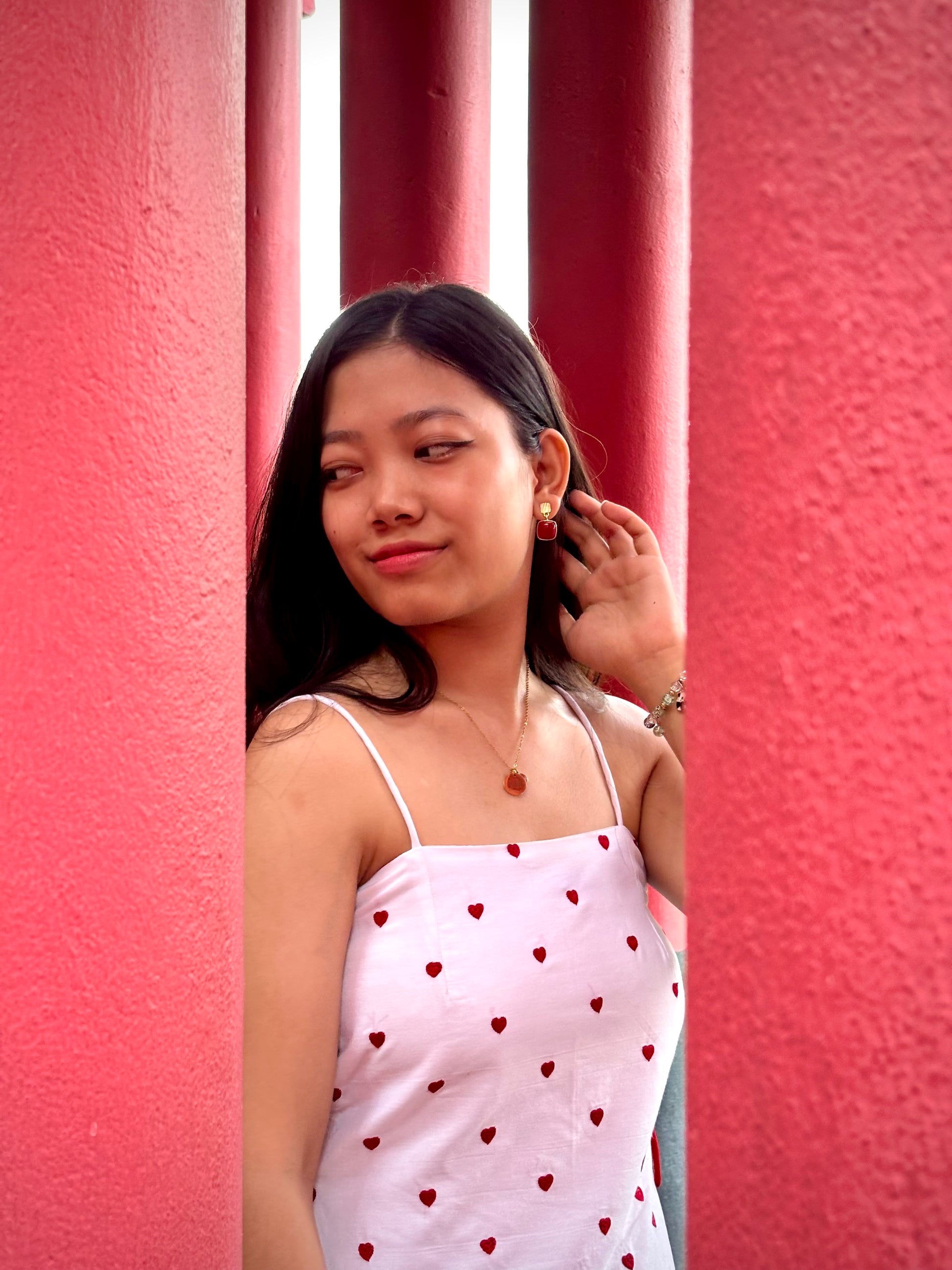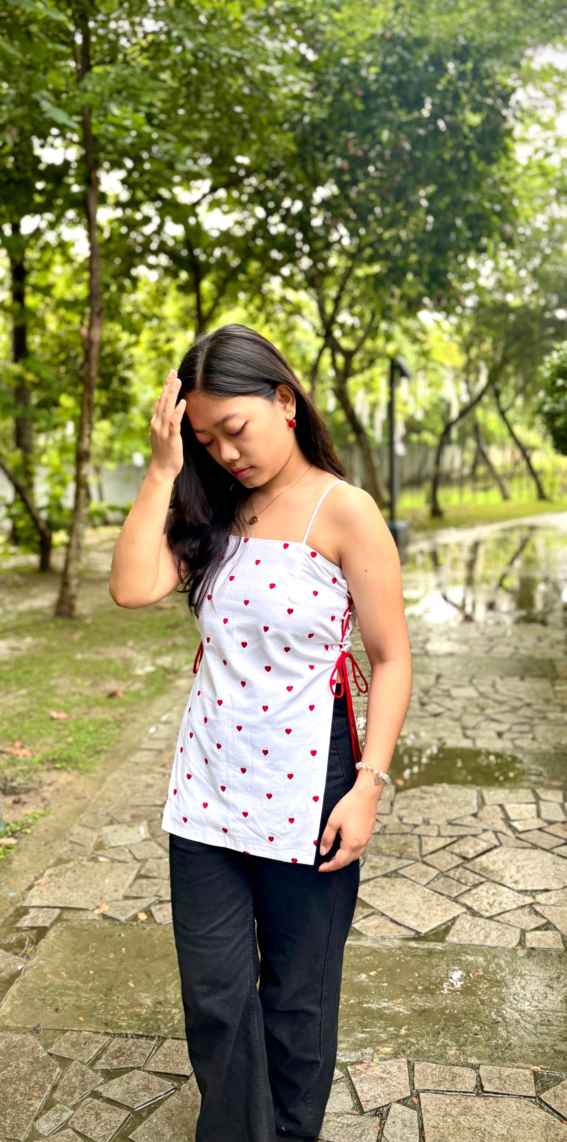 The Amore Top is a delicate expression of romance and playfulness. Crafted in breathable cotton, this piece features tiny red hearts, meticulously hand-embroidered across a crisp white base, which is double lined. The flattering straight neckline is balanced by dainty spaghetti straps, while the adjustable side ties, in matching red cords, add a touch of charm and allow for a personalised fit.